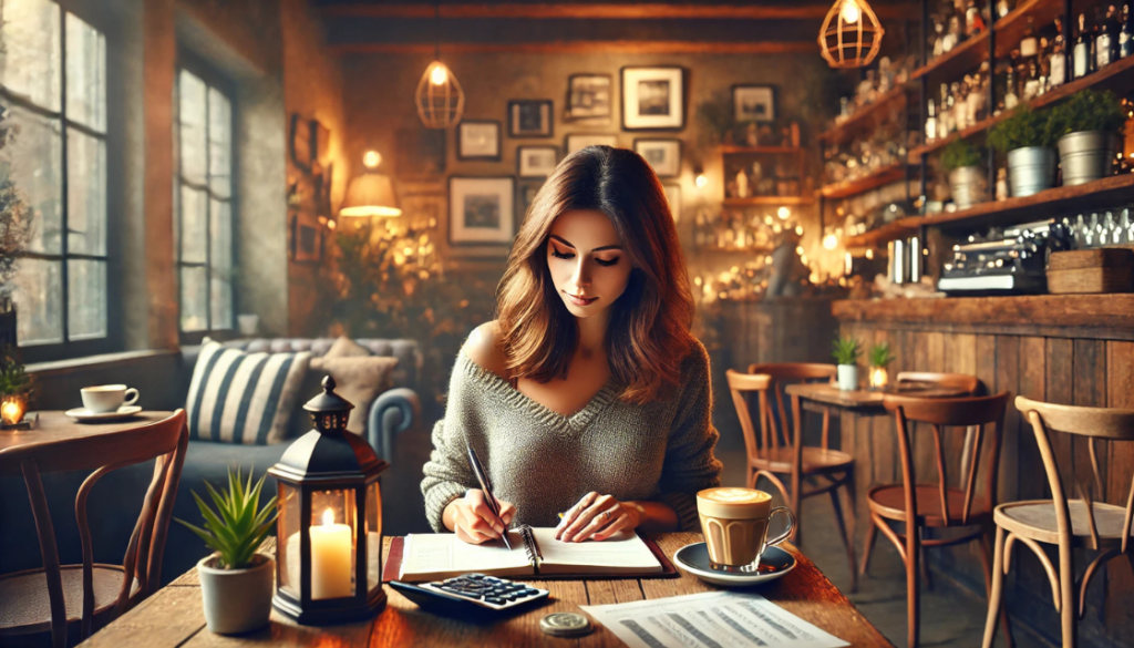 Photo 1: A woman sitting at a cozy coffee shop, with a notebook and a calculator, writing down her financial goals. This image conveys a sense of intentional planning and focus.